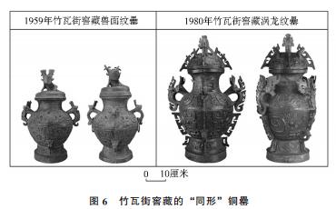 其三,三星堆遗址之后的古蜀文明中,仍然存在“商器商礼”现象。如1959年彭州竹瓦街窖藏出土的5件铜罍中有兽面纹罍2件,形制基本相同,腹部饰兽面纹,肩部饰涡龙纹,蟠龙形盖,通高分别为48、50厘米(图6)。1980年竹瓦街窖藏出土铜罍4件,其中2件涡龙纹罍形制相若,通高分别为69.4、70.2厘米(图6)。这些铜罍,都是商文化的典型器类,并遵循了偶数同形的商礼。