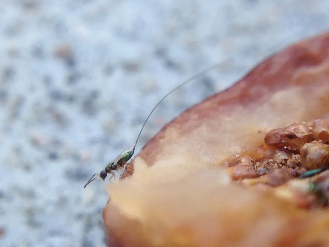 无花果是雌雄异体的植物,又因为花朵被包裹在内部,所以想要授粉,就要依靠榕小蜂。榕小蜂体格娇小,能从无花果顶端的缝隙钻入内部,并在那些含有瘿(yǐng)花(无法孕育果实的雌花)的雄性无花果中产卵,榕小蜂宝宝出生后,就以瘿花的花汁为食。