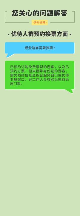 实施全面预约购票制后,游客(含符合优待政策的游客)需通过线上方式提前预约购票,景区将取消线下“即到即购”类售票窗口。同时,景区将在东游客中心服务大厅、西检票口设置综合服务窗口,提供景区咨询、票务综合业务、特殊人群预约购票换票服务等(面向无法使用智能手机或线上支付方式的游客、无居民身份证导致无法预约的境外游客等);设置优待人群专属窗口,提供景区咨询、凭预约信息核验有效证件换票服务等(面向现役军人、退役军人、消防救援人员、老人、儿童等)。当日预约售票量未达上限时,未提前预约的游客可通过即时预约方式购票或换票入园;如当日预约售票量已达上限,则无法通过即时预约方式购票或换票入园。