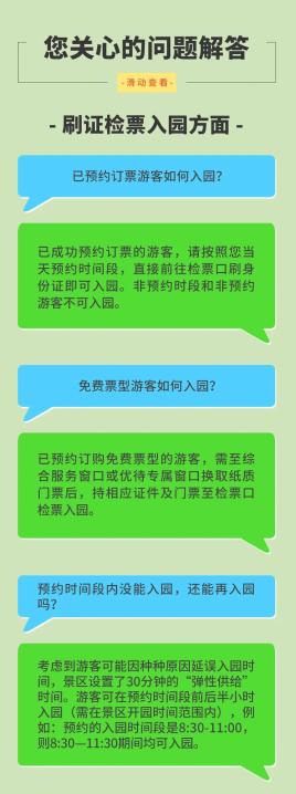 景区每日将分5个时段提供预约售票(目前暂定为8:30-10:00、10:00-11:30、11:30-13:00、13:00-14:30、14:30-16:30)。请根据您的实际行程安排,合理选择预约订票的入园日期和时段,并按照当天预约时间段入园,请勿提前或推迟入园。