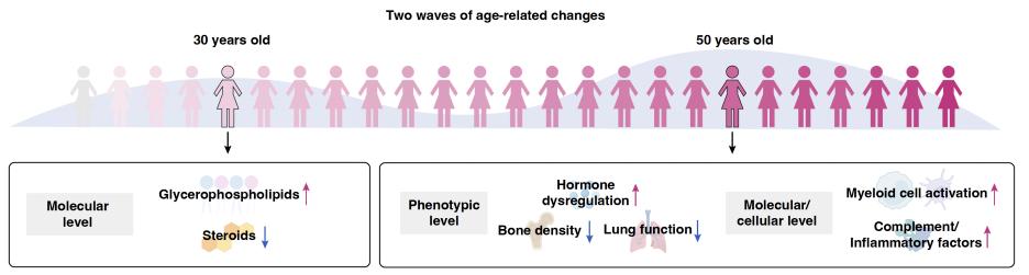 其中,30岁左右的衰老变化主要表现为代谢水平的脂质累积和类固醇减少。而到50岁左右时,女性衰老进程在器官、细胞和分子等多个层次均发生剧烈变化,包括多种增龄高度相关指标的陡升或陡降。