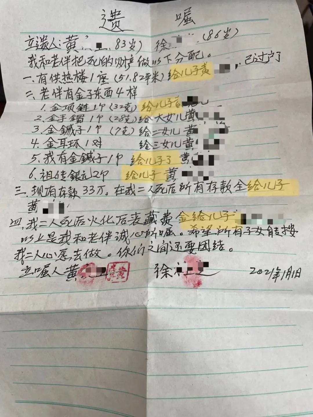 近日,辽源市西安区人民法院综合审判庭审理了这样一起继承纠纷。2021年1月,立遗嘱人黄老汉时年83岁,老伴徐大妈86岁,黄老汉考虑到二人年事已高,身体状态每况愈下,以防自己和老伴去世后,自己的四名子女就遗产分割出现争议,于是立下遗嘱,将其夫妻名下的房产一处、现金33万余元、32克金项链、金戒指一个全部由大儿子黄老大(化名)继承,并且去世后丧葬费由黄老大一并继承。大女儿黄大姐继承28克金手镯一个,二女儿黄二姐继承7克金戒指一枚,三女儿黄三姐继承金耳环一对。该份遗嘱由黄老大保管。