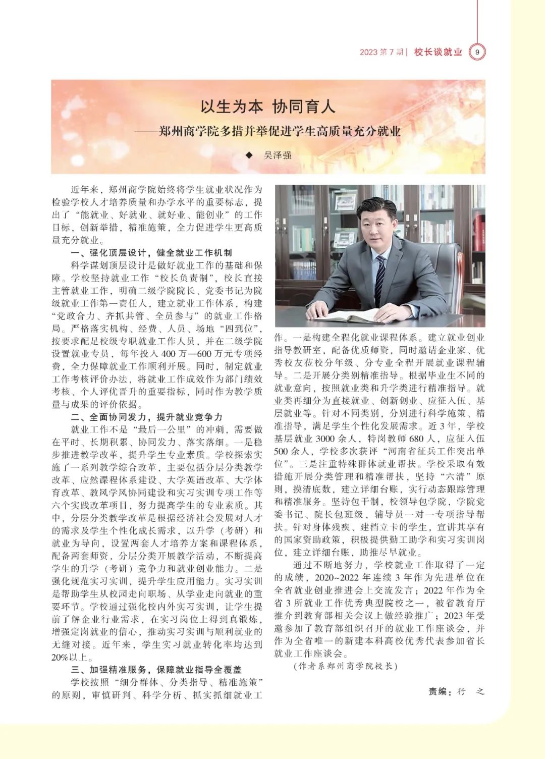 原标题:《吴泽强:以生为本 协同育人——郑州商学院多措并举促进学生高质量充分就业》