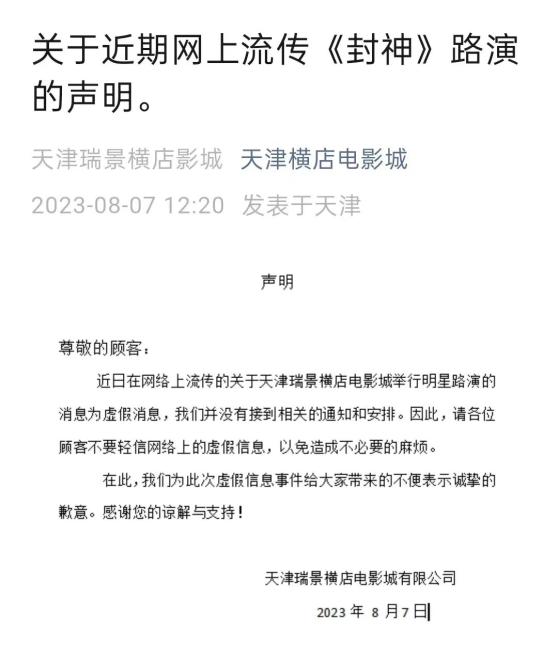 据“天津横店电影城”官方微信公众号消息,近日网络上流传的关于天津瑞景横店电影城举行明星路演的消息为虚假消息。