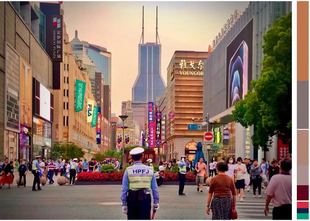 外滩是上海近代城市的起点,到20世纪40年代逐渐形成了如今的格局。米色和灰色为主的建筑安静庄严、富丽堂皇,辅以少量蓝色与金色,打破了沉闷,注入了时尚的风韵。夜晚,外滩沿线温润的暖色调灯光与历史建筑肌理纵横,浑然一体,是上海夜景色调最为和谐之处。南京路步行街沿线老商厦以朴素的米色灰调为基调,虽辅以金碧光辉和潋滟的霓虹流光,却没有琳琅满目的杂乱感,如同一张精致而略有褶皱的画纸,勾勒着熙熙攘攘的人群涌动,将城市故事娓娓托出。