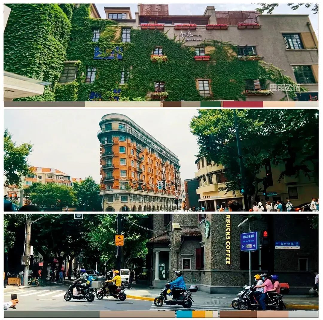 思南路与武康路是充满了法式审美与情调的居住街区,这里有着更为包容与多元的色彩。细碎的阳光、棕红的砖瓦与其上攀援的藤叶,共同构成街区闲适生活的味道。红棕、暖黄相间并辅以米白材质的多层建筑在浓绿的梧桐掩映下,温暖、明朗、平和、优雅,又展现出复古情怀中的摩登感。这里几乎完全看不到高饱和、充满跳跃感的色彩,整个街区只想让人慢下来、静下来,隐隐感受某些遥远的气息。