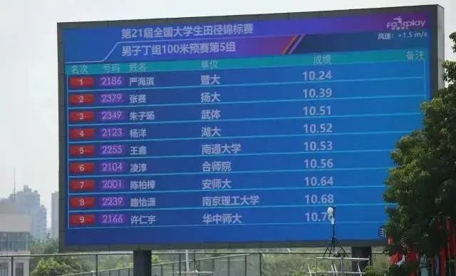 严海滨跑出10秒24(+1.5m/s)的成绩