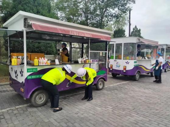 为早餐摊点摊主讲解《早餐车经营搜则》及相关政策规定,引导摊主自觉树立城市主人翁意识,遵守规定规范经营,配备垃圾桶、扫帚等保洁工具,地面铺设用于防潮隔油的地革,不得占用盲道经营,且在经营中和收摊后及时对摊点周边垃圾进行清理,不得向人行道、机动车道和绿化带倾倒垃圾、乱泼污水,保证餐车周边无乱堆乱放、无垃圾、无滴漏,做到“人走地净”,维护摊点周边环境干净整洁。