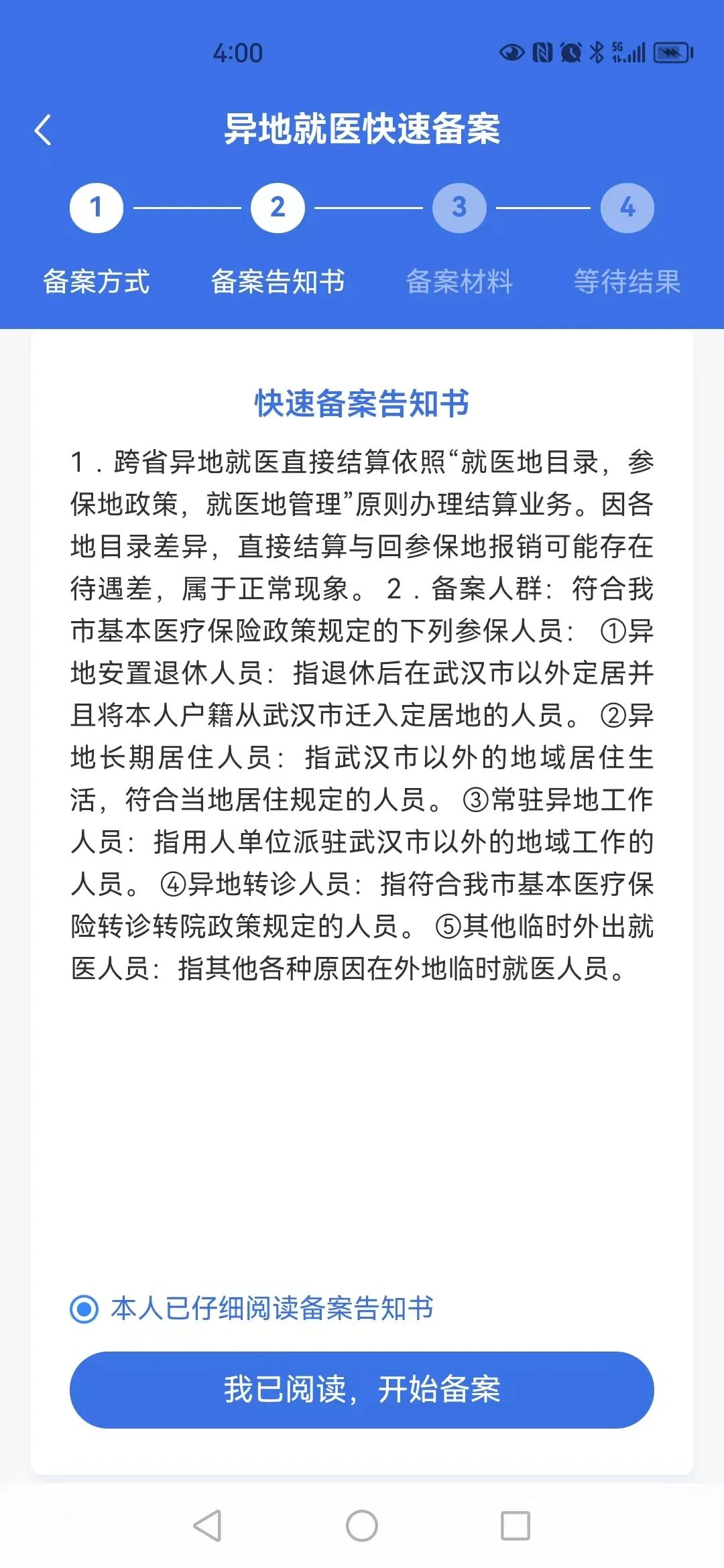 点击“我已阅读,开始备案”