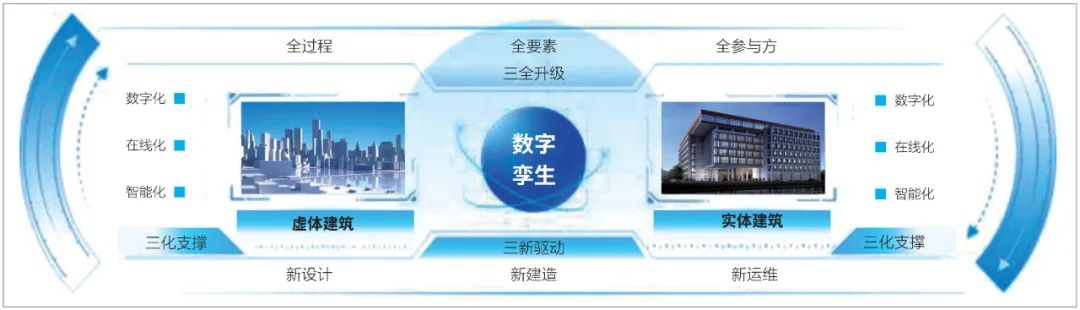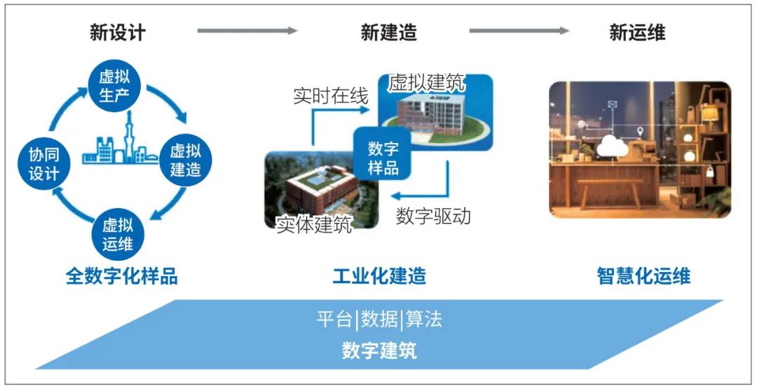 在数字建筑推动建筑产业数字化转型的过程中,新设计、新建造、新运维是核心,担负着赋能整个产业的转型升级的重任。其中,新设计是指数据驱动的高标准精细设计,以虚映实,通过平台进行协同设计打造一体化全数字样品;新建造是指数字孪生的工业建造,以虚控实,融合工厂生产和现场施工的一体化“数字生产线”,实现数字孪生建造;新运维是指虚实融合的智能运维,以实映虚,通过数字虚体建筑实现智慧化运维。