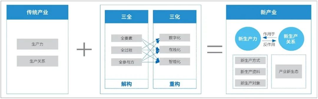 数字建筑推动建筑产业转型的重构范式,可用一个简洁的公式进行概括:传统产业+三全•三化=新产业,即传统建筑产业从全过程、全要素、全参与方三个方面进行解构,再通过数字化、在线化、智能化进行重构,形成以数据为依托的新生产要素,构建以新设计、新建造、新运维为代表的“三新”生产力,最终驱动建筑产业全过程、全要素、全参与方的升级,形成数字化转型下的新产业。