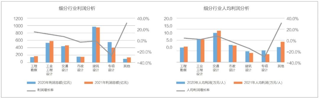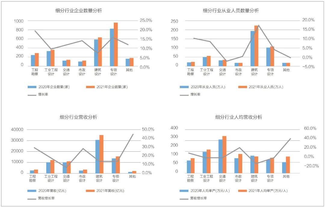 设计师的价值创造能力与其创造的营收成正比。《工程勘察设计行业年度发展研究报告(2022)》中数据显示,建筑设计及专项设计类企业和从业人员数量最多、营收规模最大,但人均产值较低,处在中下游水平,而且建筑设计类人均单产出现负增长。