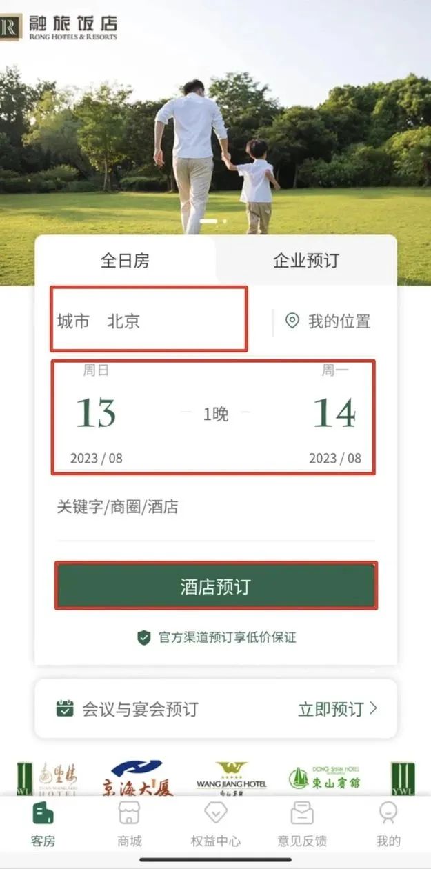 在手机微信中搜索“中国融旅饭店”并打开,或扫描“融旅饭店预订”二维码进入,在“预订中心”用户可选择拟入住的酒店、日期和房型。