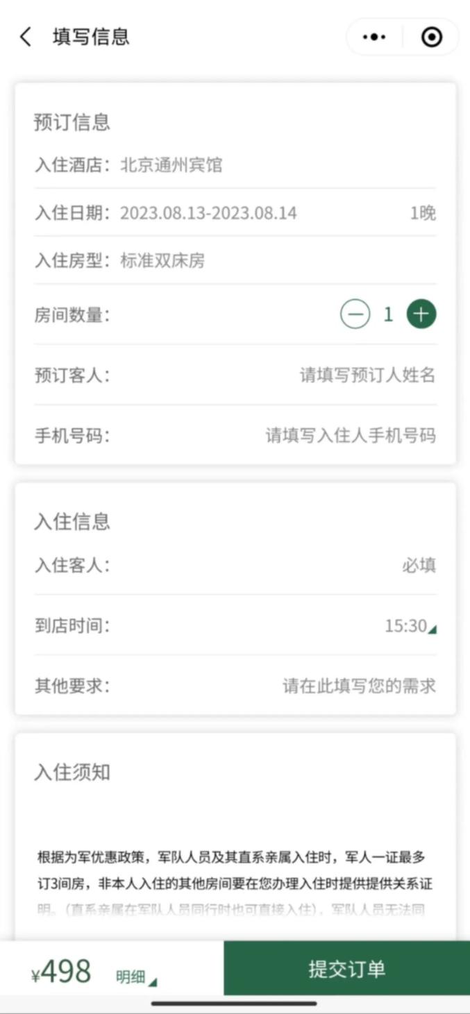 4、根据为军优惠政策,军队人员及其直系亲属入住时,军人一证每日最多订三间房。军人直系亲属入住的房间,要在办理入住时提供直系亲属军队人员相关证件(或复印件、电子照片),如无法提供相关证明,则无法入住。