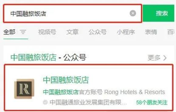 在微信搜索中输入“中国融旅饭店”, 点击关注公众号(图14)