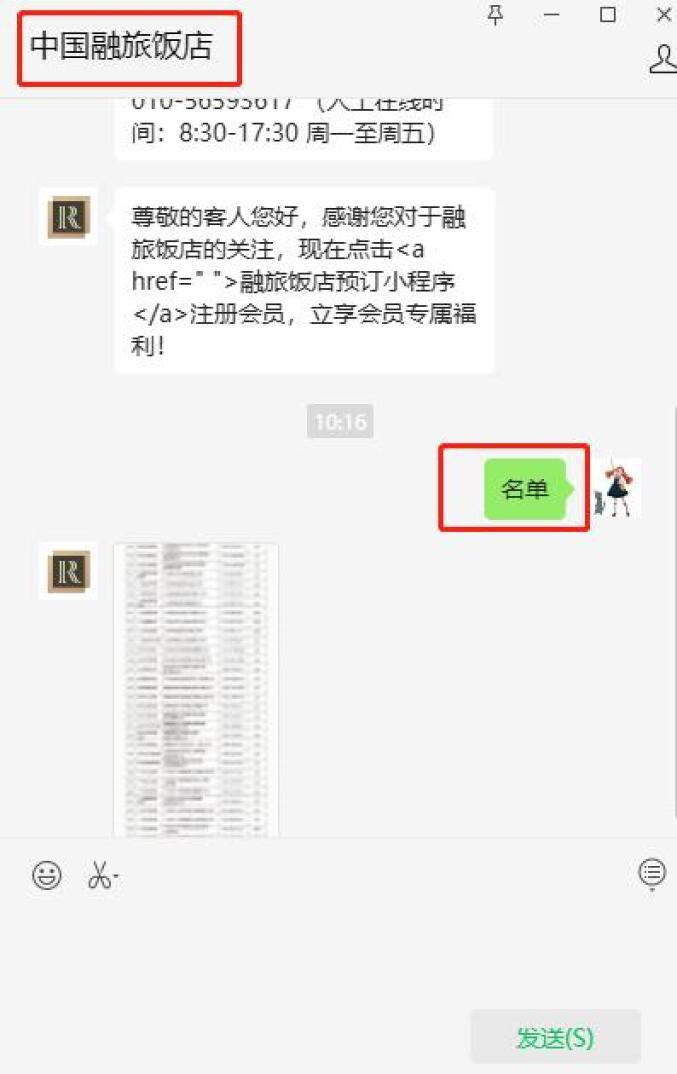 在“中国融旅饭店”微信公众号后台回复“名单”(图16),即可获取酒店联系电话等内容
