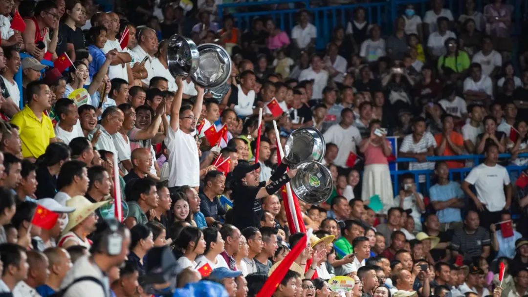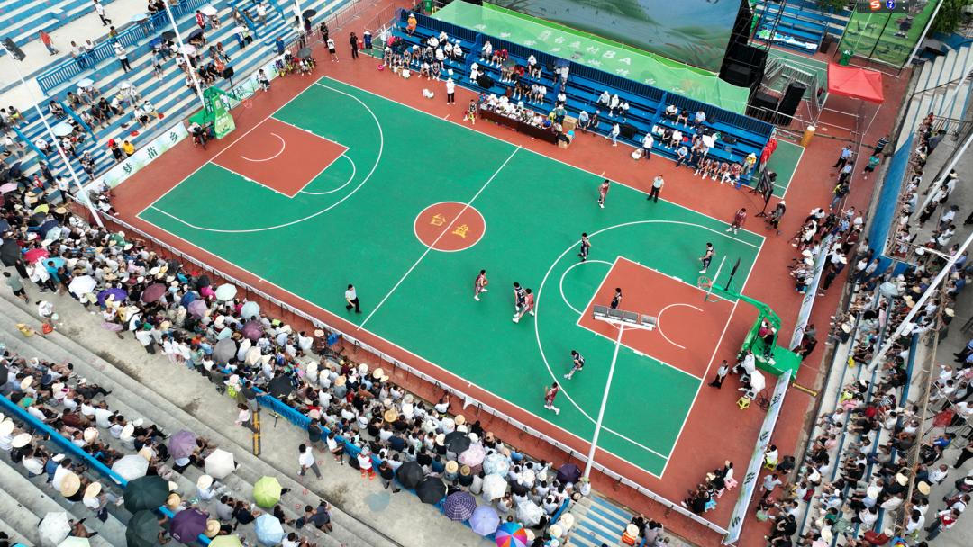 现场,场内球员们挥洒汗水,场外人头攒动。台盘村本地农民群众和来自全国各地的逾万名观众观看,并现场体验农趣农味的篮球互动游戏。