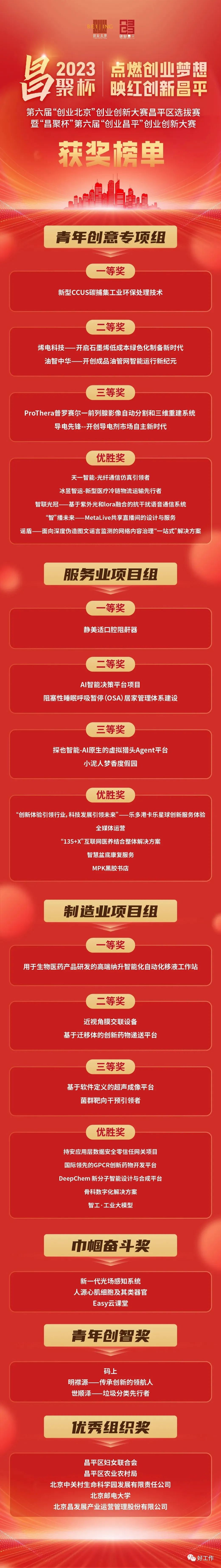 此次参赛的制造业组、服务业组以及青年创意专项组分别评选出一等奖1名,二等奖2名,三等奖2名,以及优胜奖5名。用于生物医药产品研发的高端纳升智能化自动化移液工作站项目、静美适口腔阻鼾器项目、新型CCUS碳捕集工业环保处理技术项目分别摘得制造业组、服务业组以及青年创意专项组三个组别的桂冠。此外,还颁发了巾帼奋斗奖、青年创智奖、优秀组织奖等,旨在表彰在此次大赛中表现突出的个人及单位。谈及本次比赛,获得制造业组第一名的雷奥顶峰创始人王磊说:“2022年我辞职选择创业,这是我第一次参加该项赛事。大赛让我有机会与各位创业导师进行深度交流,他们对我的帮助与指点,让我在创业路上少走了许多弯路;同时,让我看到了政府对创业创新工作的支持,各类培训与服务再次点燃了每位创业者的创业激情;而昌平区的产业对接等配套服务也能让我在未来的创业路上走得更远。”