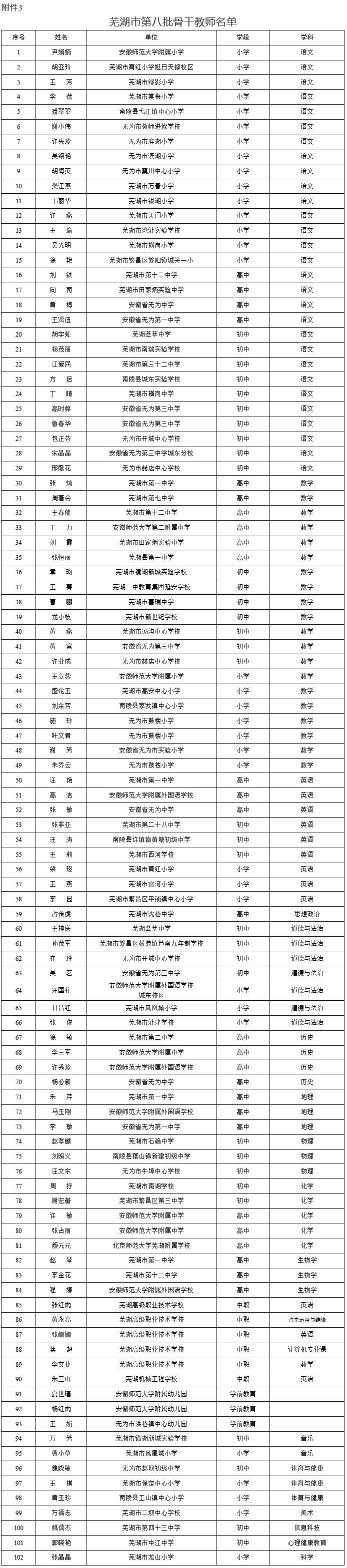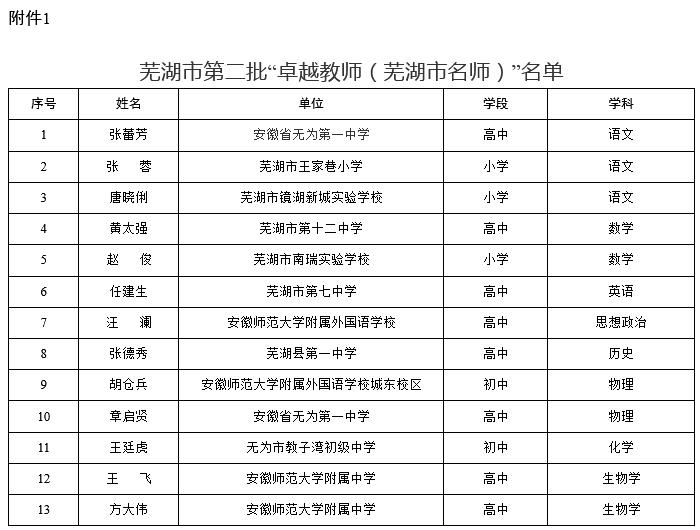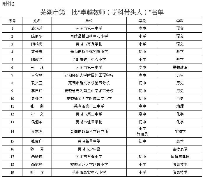 “卓越教师(芜湖市名师)”名单