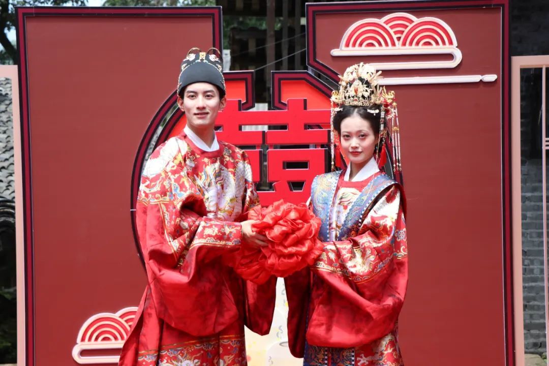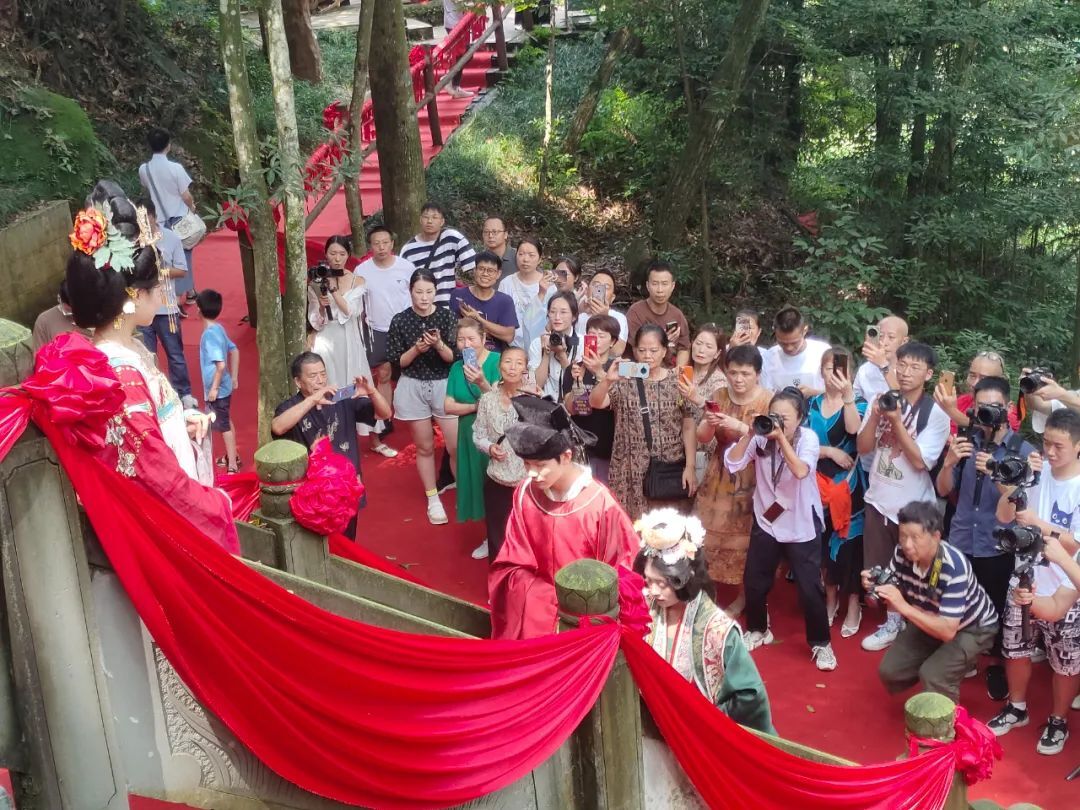 “开场宣礼、迎亲、教拜礼、对席礼、沃盥礼、同牢礼、合卺礼、解缨结发、执手礼,礼成!”红豆相思谷因一棵千年红豆树而闻名,以红豆之名见证最美的爱情。上午11时左右,一场红豆相思谷宋式婚礼活动在千年红豆树下开启,身着传统服饰的新人们举行婚礼仪式。