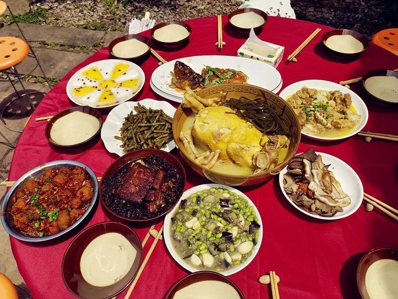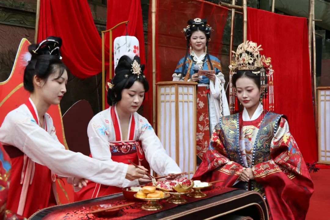 川西传统婚礼,怎少得了“九大碗”,活动方在那屋民宿准备了最具川西特色的九大碗婚宴,美食博主、美食家等参与活动,人们参与品尝,从味觉感受传统习俗的魅力。