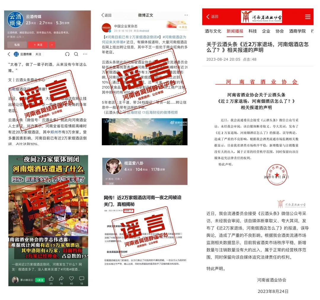 8月15日,北京云酒传媒有限公司主办的微信公众号“云酒头条”,曲解夸大河南省酒业协会流通委员会有关人员在电话咨询中陈述原意,发布题为“近2万家退场,河南烟酒店怎么了”的不实信息。随后,“中国企业家杂志”微博账号等新闻媒体进行转发。