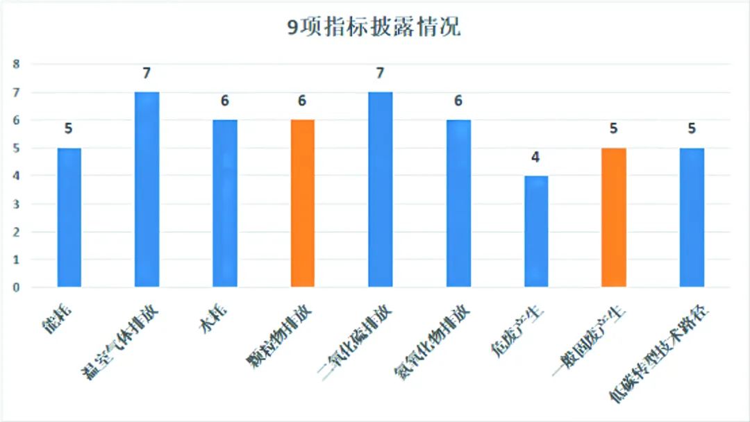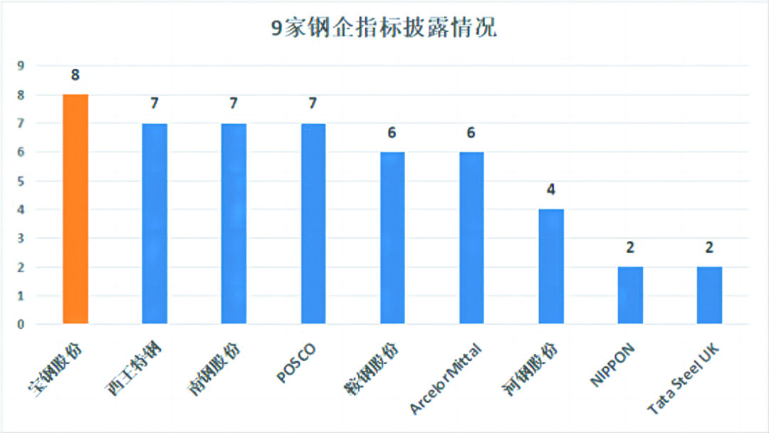 通过分析对比9家钢铁企业ESG报告的9项指标发现,从总体的披露情况来看,披露二氧化硫排放和温室气体排放的企业最多,达7家;披露危废产生的企业最少,仅有4家。值得注意的是,9家钢铁企业中,披露指标最多的为宝钢股份,共达8项;披露最少的为日本制铁和塔塔钢铁—英国,披露内容只有两项。