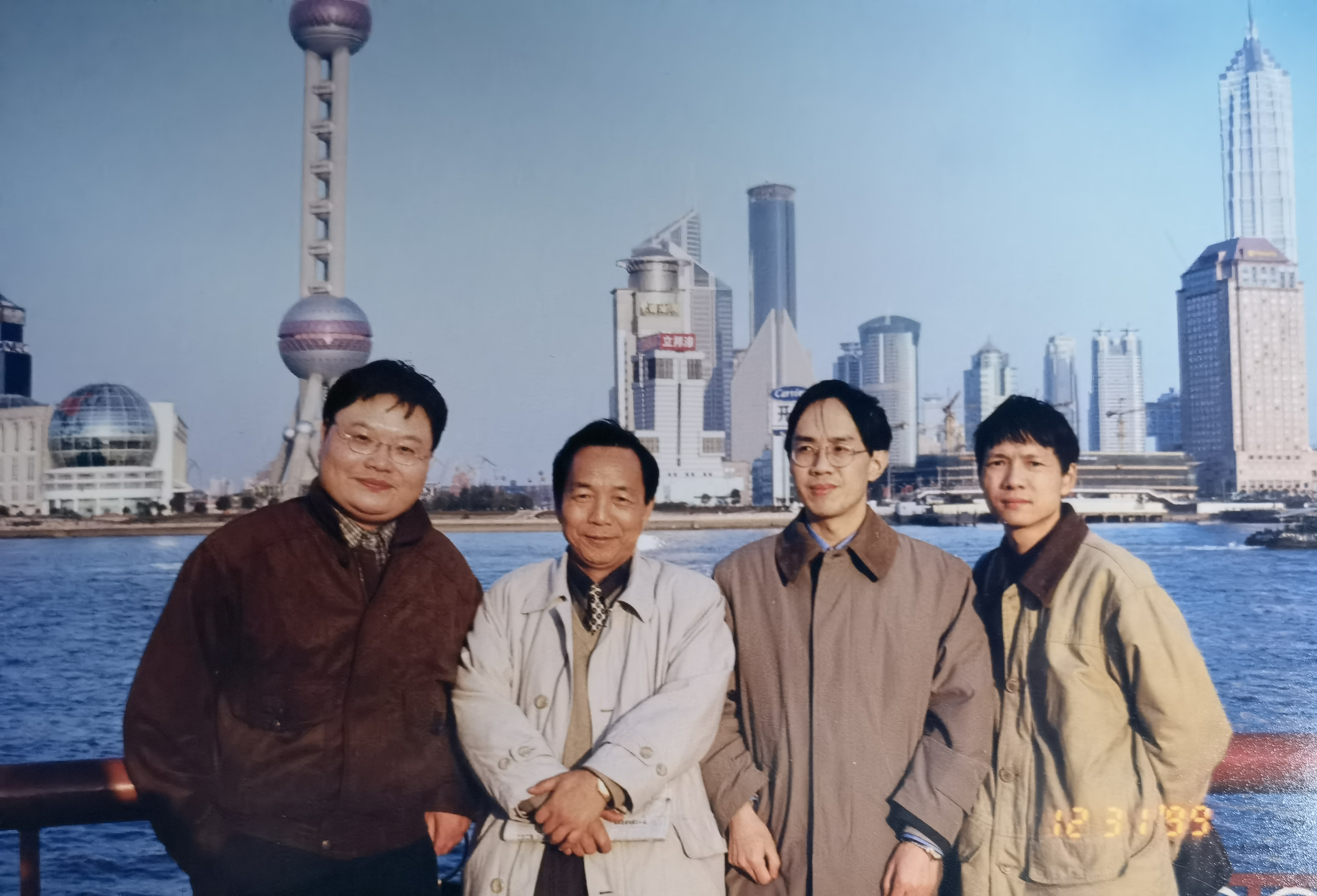 李人凡(左二)、本文作者倪文尖(右一)、罗岗(左一)、季桂保(右二)合影于上海外滩,1999年12月31日。