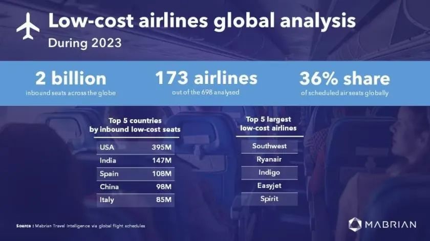 Mabrian找到了173家廉航,按总运量计算,廉价航班客运量最多的是美国,拥有超过3.95亿个座位,印度有1.47亿个座位,西班牙有1.08亿个座位,中国有9800万个座位,意大利有8500万个低成本座位。