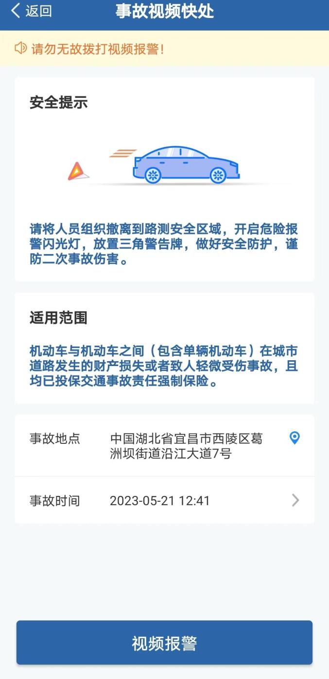 当事人发生轻微交通事故后,直接在“交管12123”页面点击“事故视频快处”,视频连线接警中心坐席人员,在接警人员引导下完成事故取证,在线快速处置、快速定责,车辆快速撤离。