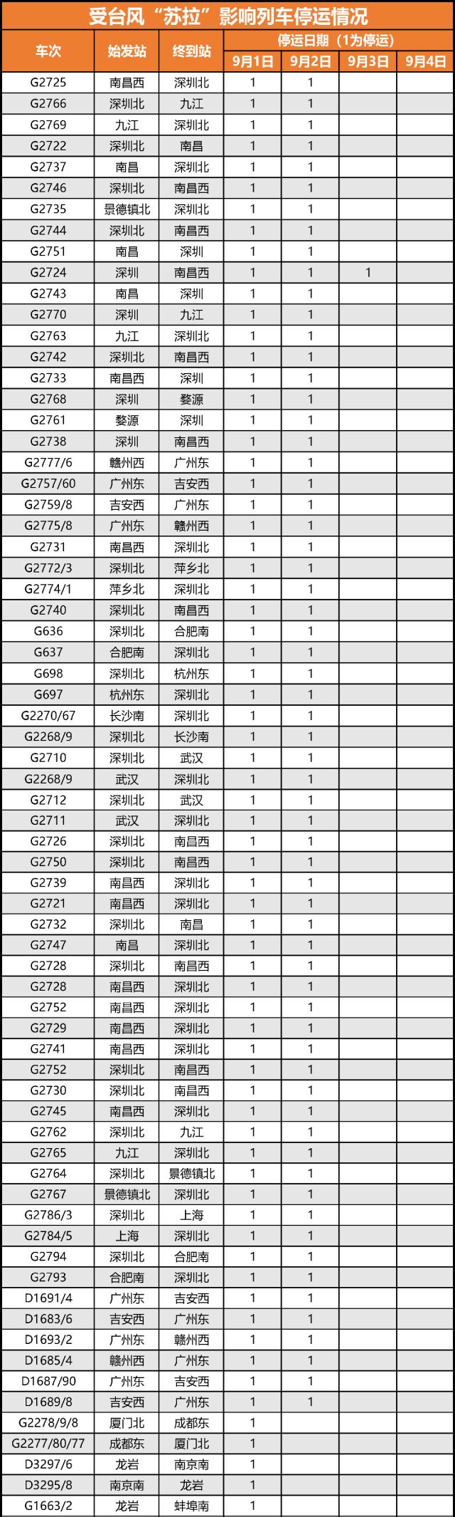 “苏拉”逼近!南铁动态调整旅客列车!为应对台风影响,在确保铁路运输安全的前提下,满足旅客出行需求,南铁动态调整部分旅客列车运行方案。