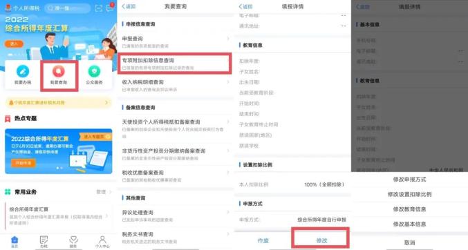 登录个人所得税APP,在首页点击“我要查询”,打开专项附加扣除填报记录,选择需要修改的填报记录,点击右下方修改,选择需要修改的内容进行修改。