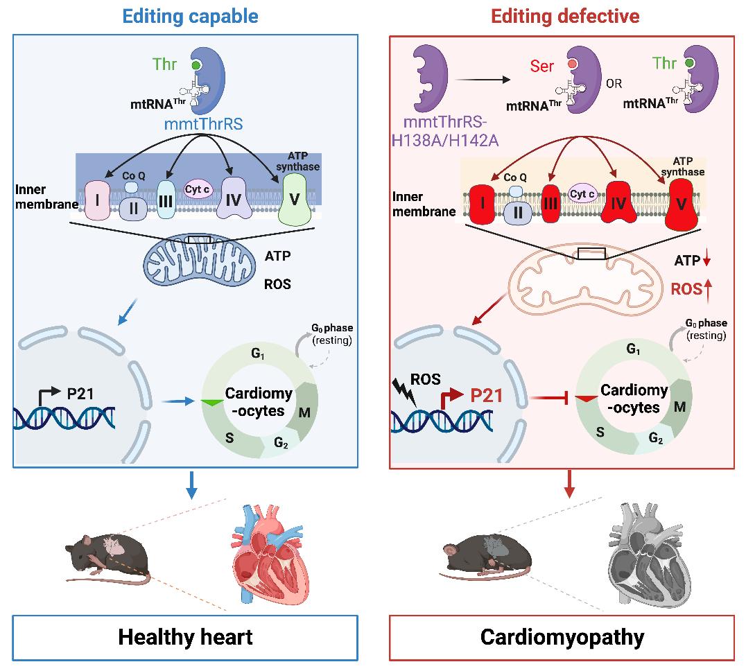 为了回答线粒体是否需要翻译保真性机制,研究人员首先通过体外生化实验证明,小鼠线粒体苏氨酰-tRNA合成酶 (Tars2) 具有编校Ser-tRNAThr的能力,且H138以及H142是Tars2的编校活性中心;通过CRISPR/Cas9方法,构建了含有编校活性中心双突变(H138A/H142A)的NIH3T3细胞系 (NIH3T3-MU),发现H138A/H142A突变使线粒体tRNAThr误接载Ser,形成的Ser-tRNAThr有效地被线粒体翻译机器作为原料利用,在线粒体基因组编码的蛋白质中含有大量的Thr被Ser误掺的肽段,导致呼吸链复合物活力下调、氧化呼吸能力减弱等。进一步研究发现,线粒体翻译保真性缺失导致细胞内氧化应激,通过上调p53调控Cdk2-Cyclin E相互作用,将NIH3T3-MU细胞周期阻滞在G0/G1期;用抗氧化剂N-乙酰半胱氨酸 (NAC) 可以有效地解除细胞周期阻滞。研究者还构建了小鼠心肌细胞HL-1的H138A/H142A突变细胞系 (HL-1-MU),在HL-1-MU细胞中同样观察到误氨基酰化、损伤的线粒体翻译、氧化应激、细胞周期阻滞、呼吸链复合物活力下调、氧化呼吸能力减弱等现象,提示了不同细胞类型对于线粒体翻译保真性失调具有类似的细胞效应。通过CRISPR/Cas9方法,构建了H138A/H142A全身突变小鼠模型,发现H138A/H142A全身突变小鼠胚胎致死。进一步获得了心肌细胞特异性H138A/H142A突变小鼠,发现心脏功能损伤、心肌纤维化等表型;通过分离小鼠原代心肌细胞,观察到心肌细胞氧化应激以及细胞周期阻滞等现象。