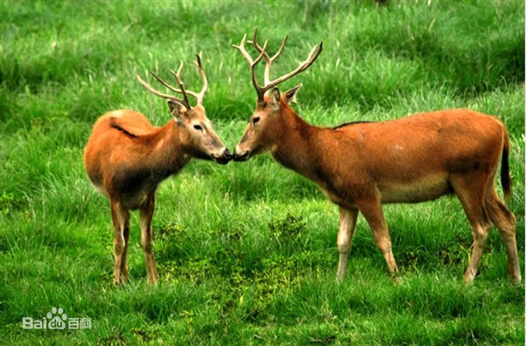 麋鹿是鹿科、麋鹿属唯一的鹿类动物。因为它头脸狭长像马、角像鹿又与其它鹿略有不同、蹄子宽大像牛、尾细长像驴,因此又名四不像。它的角形独特,形状与其它鹿的犄角正好相反,前杈再分小杈,而后杈几乎不分叉。头大,吻部狭长,鼻端裸露部分宽大,眼小,眶下腺非常显著。四肢粗壮,主蹄宽大、多肉,有很发达的悬蹄,行走时带有响亮的磕碰声。麋鹿喜好沼泽湿地生境,以青草和水草为食物。性好合群,善游泳,喜欢以嫩草和水生植物为食。夏季求偶发情,比其它大多数鹿类都早一个季度。
