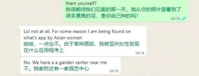 例如,在“聊天范例”中,诈骗人员伪装的女性询问对方:“我从你的照片里看到了很多漂亮的花,是你自己种的吗?”张先生说,其目的就是想判断对方的居住环境。
