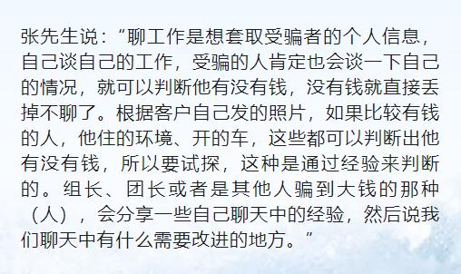 诈骗人员会同时与几位受害人聊天。经过大量的对话,诈骗人员会套取受害人的工作、住址等信息,并梳理每个受害人的特征加以标注,在此过程中,判断对方是否有钱,是否容易上当,理论文档特别要求诈骗人员牢记“要么不开张,开张吃三年的逻辑思维”。