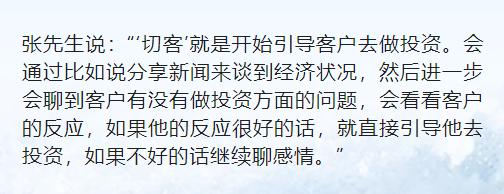 张先生说:“家庭成员也有需要编,因为我们业务员只是负责聊感情,获得客户的信任,后面聊到金融投资的话题的时候,会跟客户说自己对这方面不了解,可以给他介绍自己的叔叔或者阿姨,让自己叔叔阿姨会给他们讲解投资的知识,把他们转接给叔叔或者阿姨的角色。”