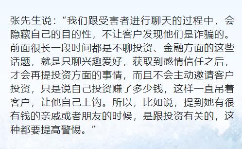 张先生:诈骗园区的人比普通人更加关注反诈新闻,他们经常刷抖音里的反诈新闻,也会搜集网上曝光的诈骗案例,针对最新的反诈宣传来“改进”自己的诈骗方式。建议大家在网络聊天中,遇到陌生人提及投资理财时,一定要多个心眼,不管你们在其他话题上聊得有多好都要注意防范。
