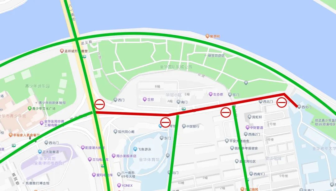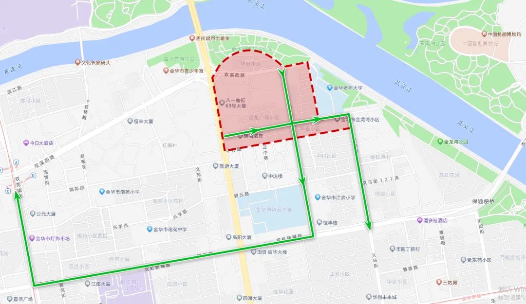 金龙广场、华夏小区、金龙湾小区、金华老年大学、人行宿舍小区及周边住户往江北方向的车辆可沿亚峰路、明伦街或义乌街向南行驶绕行至附近线路。