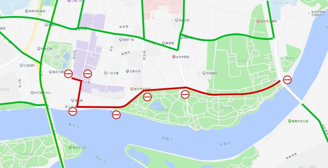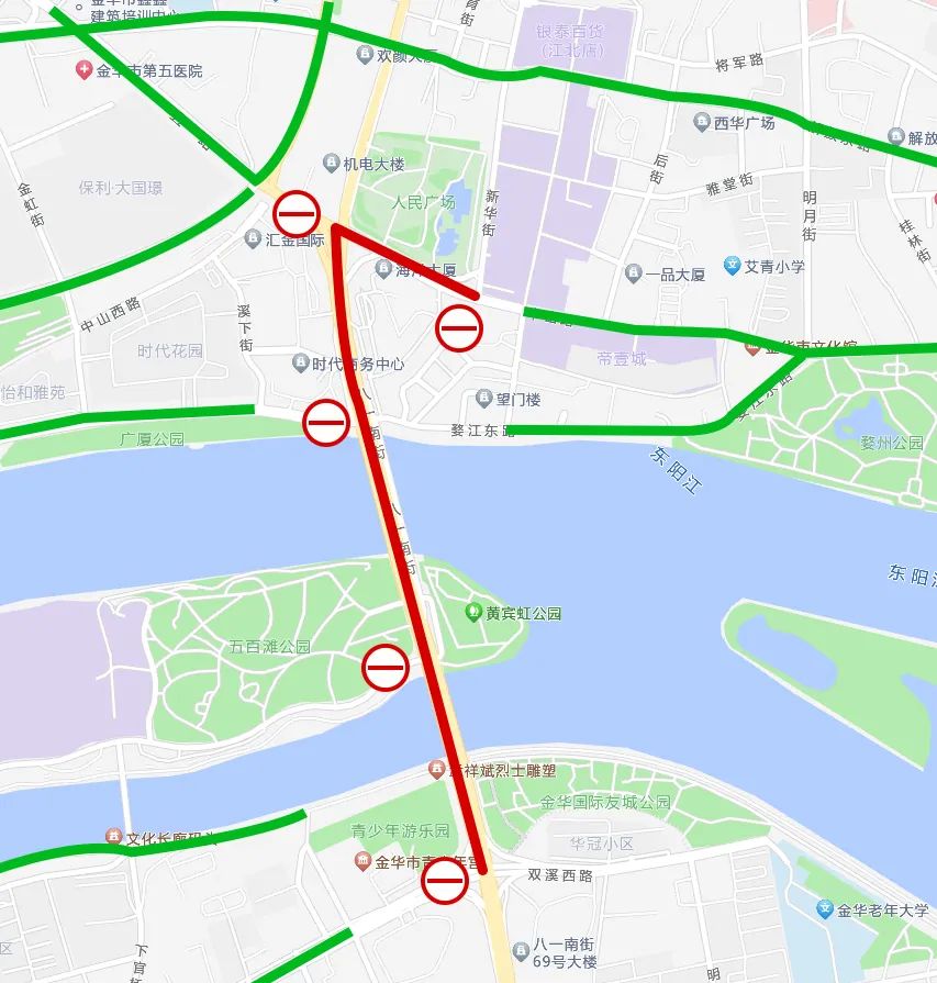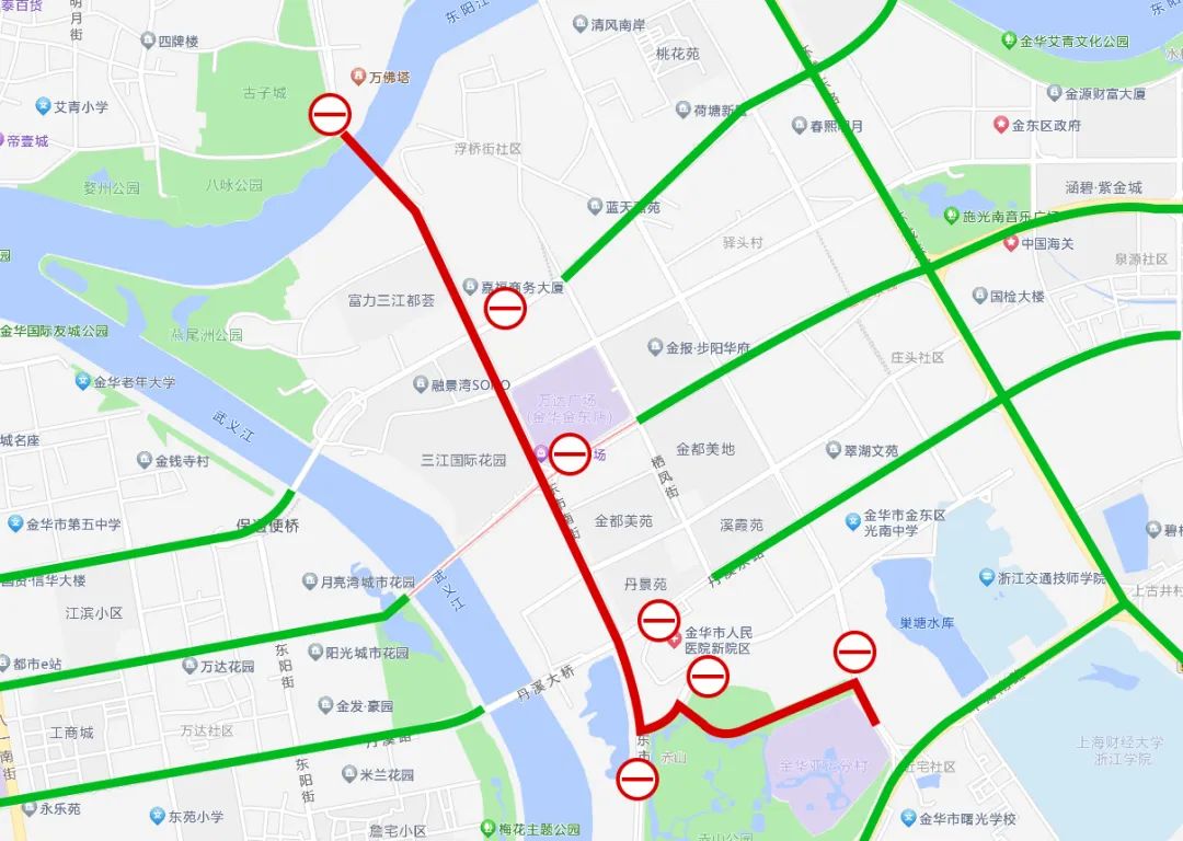 10:10—10:50期间江南前往金东车辆建议避开金婺大桥、李渔大桥、丹溪大桥,就近从东阳街绕行至环城南路,或可经八一南街、双龙南街绕行至环城南路。
