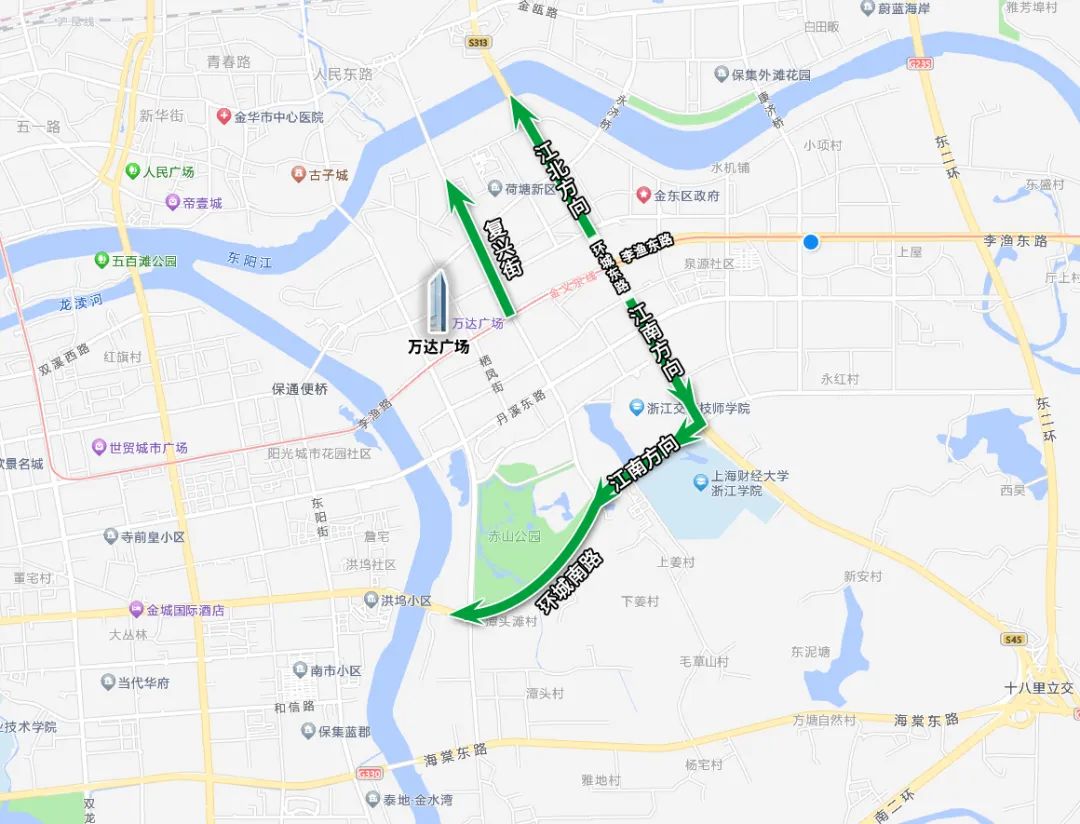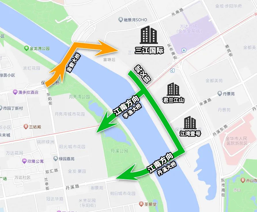 君兰江山、江湾一号、三江国际:建议车辆经由武义街通往丹溪大桥或李渔大桥到江南,再由江南至金东方向或江北方向;进入小区车辆建议经由环城南路、宾虹路、金婺大桥至武义街驶入。
