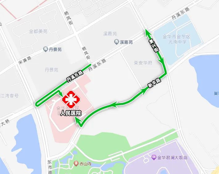 通行人民医院车辆可从新丰路南门进出,或从丹溪东路至东市南街掉头至人民医院北门进入,由人民医院南门出。