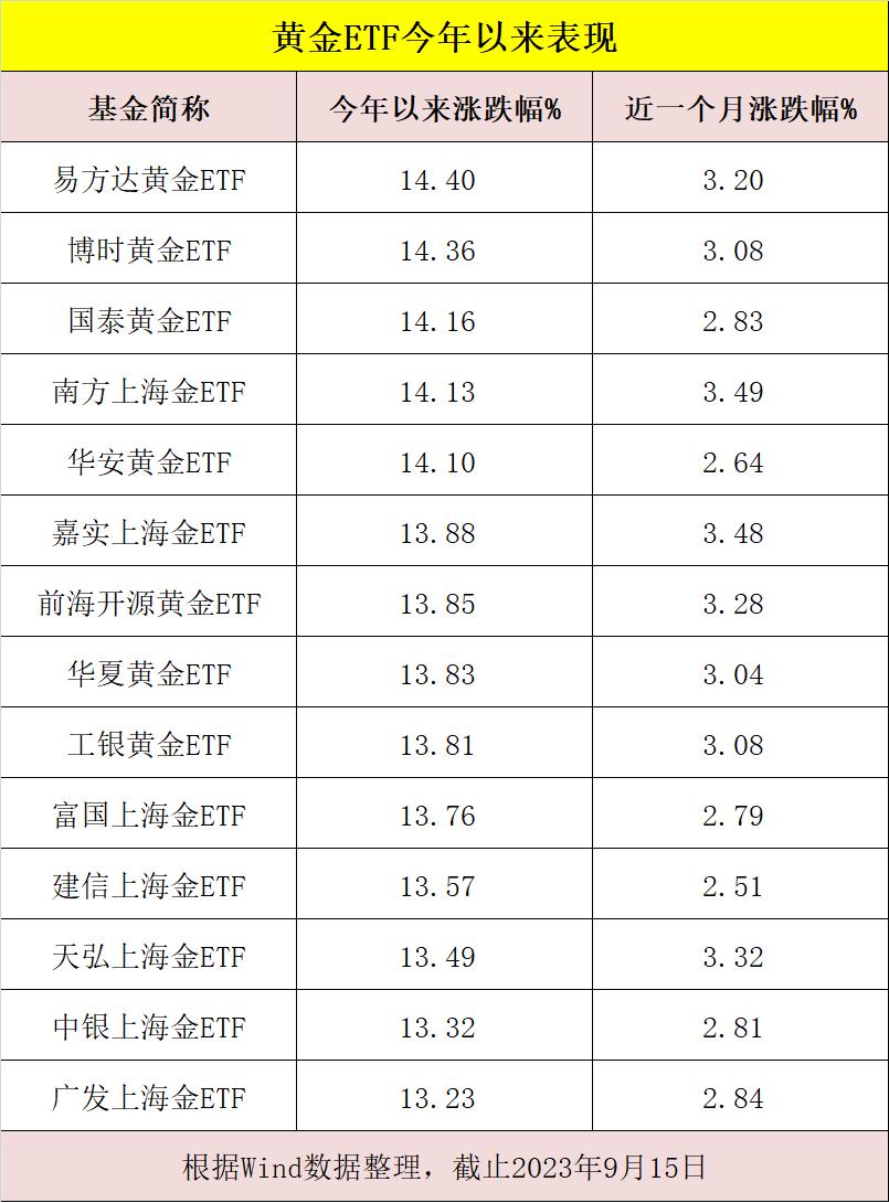 近一个月来,黄金类ETF涨幅较为明显。Wind数据显示,截至9月15日,近一个月,华安黄金ETF、国泰黄金ETF、易方达黄金ETF、博时黄金ETF等14只黄金类ETF涨幅超过2.75%;多只投资上海黄金交易所Au99.99的黄金ETF,今年以来收益率都达到13%、14%左右。