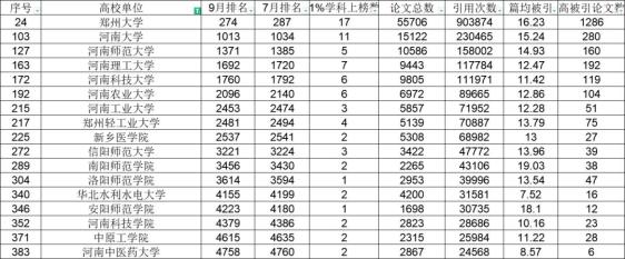 本次河南高校学科变化情况中,郑州大学的工程科学、药理学与毒物学新晋全球1‰学科,河南大学和河南理工大学的计算机科学、河南农业大学的生物与生化、华北水利水电大学环境/生态学、南阳师范学院材料科学新晋全球前1%学科。