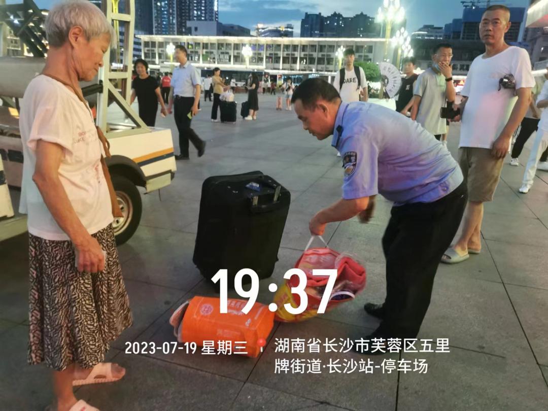 今年7月的一个晚上,长沙火车站综合事务中心巡防队员冷美云和陈连山在日常巡逻时发现一名高龄老人孤身一人拖着行李茫然地独自游荡在广场上,通过询问得知老人不会买票,遂紧急帮助老人购票并帮助其搬运行李进站。