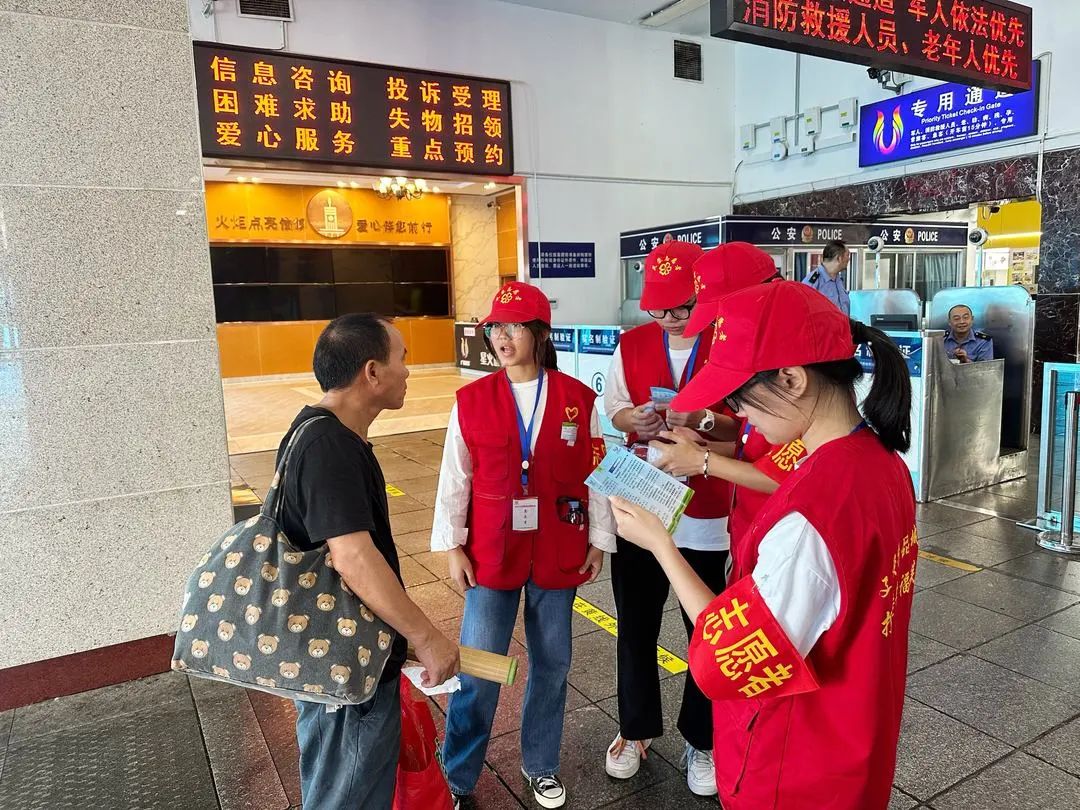 志愿者通过查询《志愿服务应知应会》折页为旅客提供信息服务