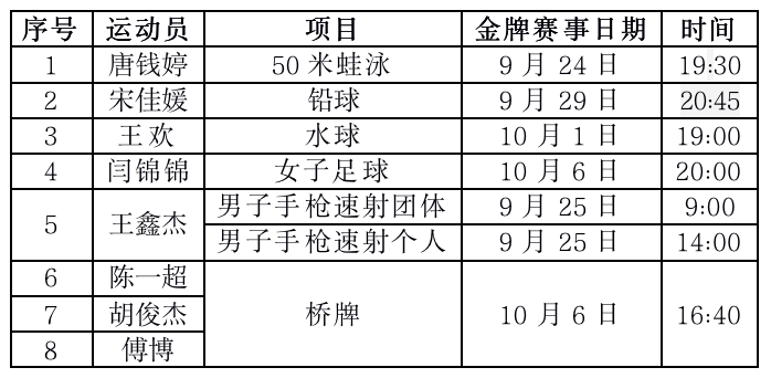 杭州亚运会将于9月23日至10月8日举行,中国体育代表团名单也已正式出炉。在公布的中国队参赛名单中,上海共有87名运动员入选,有8位长宁区培养输送的运动员榜上有名,他们是游泳运动员唐钱婷,田径运动员宋佳媛,射击运动员王鑫杰,水球运动员王欢,足球运动员闫锦锦,桥牌运动员陈一超、胡俊杰和傅博,都曾在各自领域的体育赛事中获得佳绩。