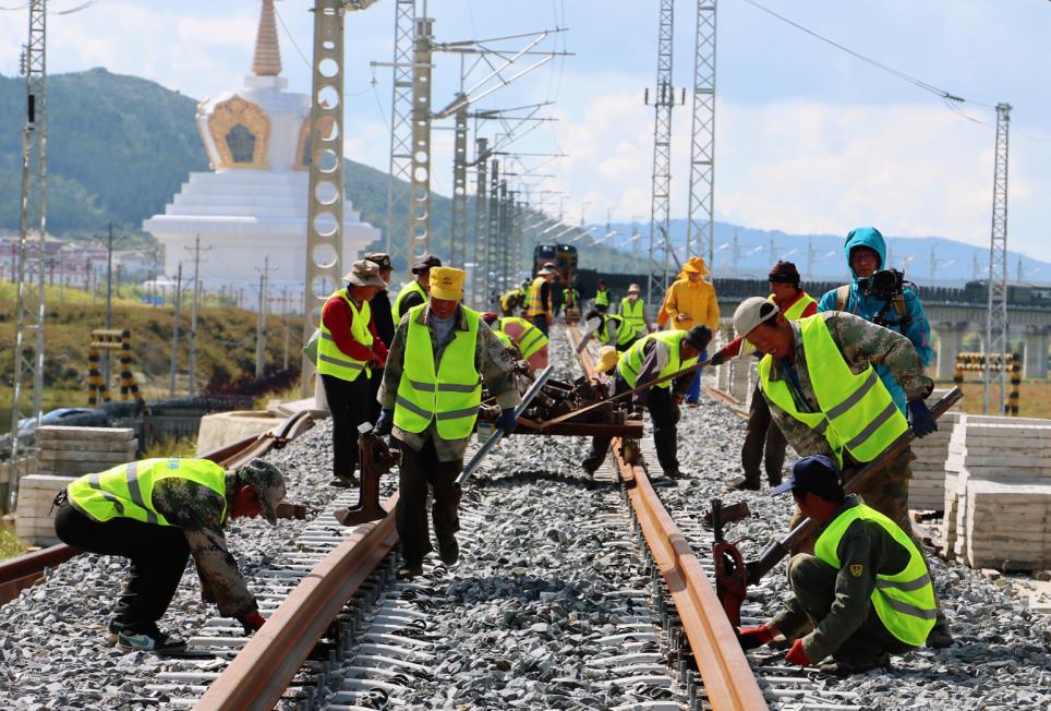 滇藏铁路丽江至香格里拉段铺轨过程中,经历了地形复杂、海拔高、交通不便、隧道工程比例高、线路坡度大等一个个“拦路虎”,中铁二十一局的建设者们迎难而上,攻坚克难,不断优化方案和资源配置,创新施工工艺,改造机械设备,采用机械化、自动化铺轨机组和施工信息化等手段,大幅提高了轨道几何尺寸的精度和施工效率,自今年7月12日轨道铺设至迪庆境内以来,1000余名工作人员两班倒,24小时不间断施工,用时两个多月,完成了后续长大坡道、桥隧相连地段铺轨和架梁铺架任务,创造了高原铁路单日铺轨8公里的纪录。