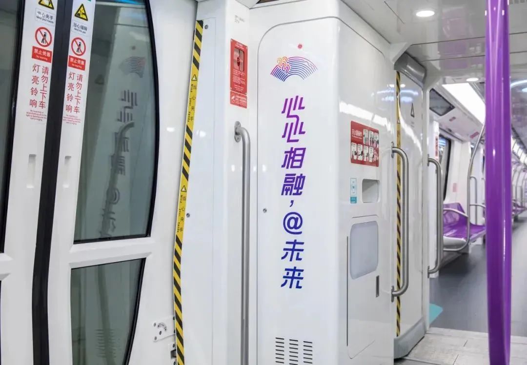 杭州地铁1号线为亚运主题专列,采用B型车,4动2拖6辆编组,最高运行速度为80km/h。列车以亚运“润泽”系统的紫色系和青色系为主色调,配合线路的主题色,打造沉浸式亚运氛围。