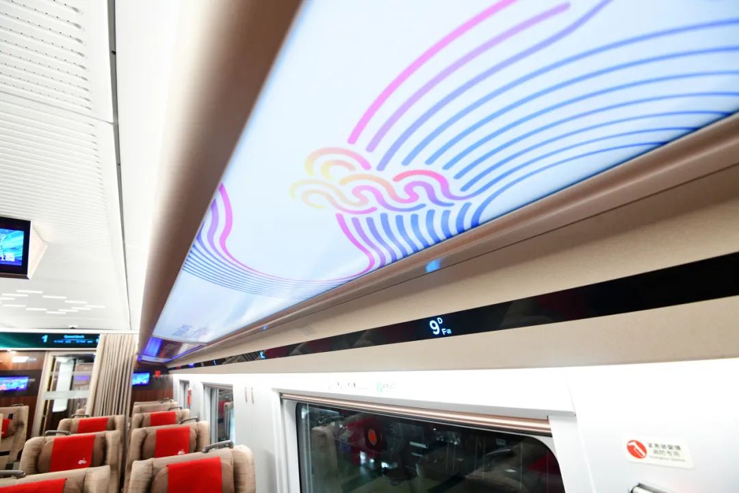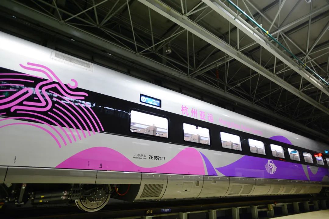 列车以“润泽江南”为外观和内饰主题,“身披”第19届杭州亚运会主形象色“虹韵紫”,在端门、玻璃隔断、行李架等处,亚运会会徽、口号等共同组成列车的特色装饰,同时具有定制化、绿色、智能、舒适等特点。
